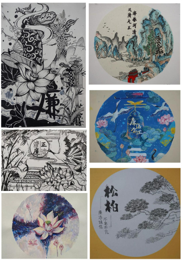 学生通过清廉内涵的解读,结合廉洁故事、廉洁人物、廉洁文化活动等进行艺术创作。作品所描绘的历史廉政事件、人物场景、人物服饰遵循历史原貌,用墨染出莲的清奇,用笔画出梅的傲骨,主题明确、立意鲜明、导向正确。