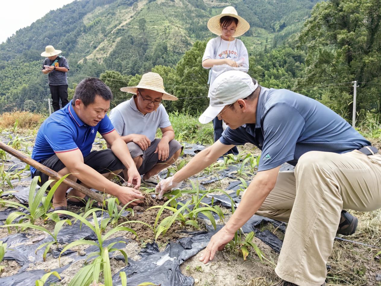 图为团队成员为白芨种植户讲解技术和防治知识。