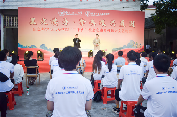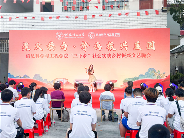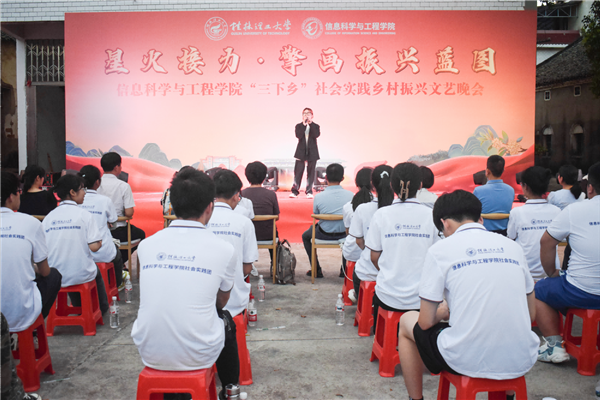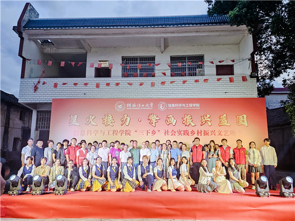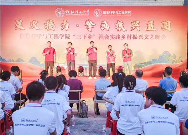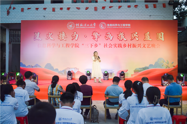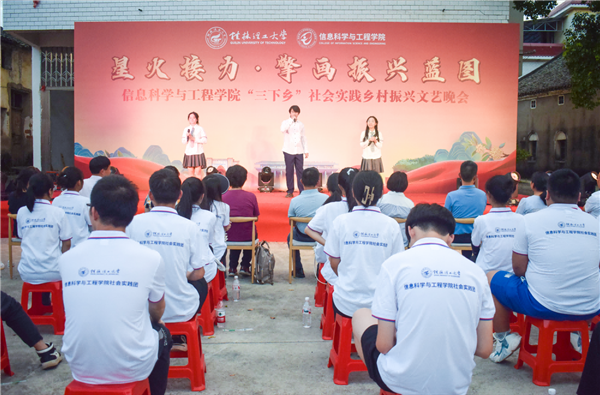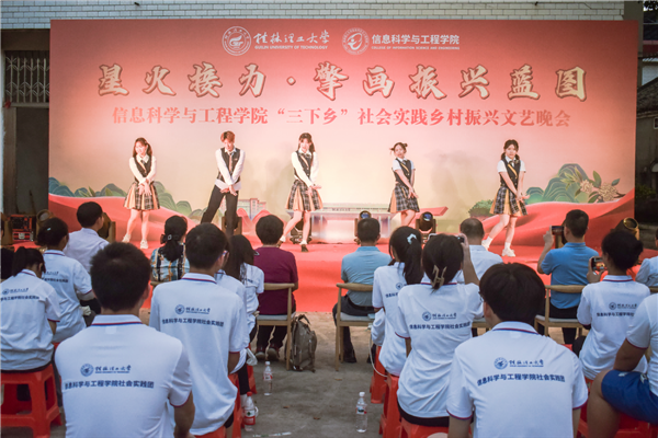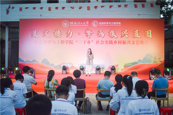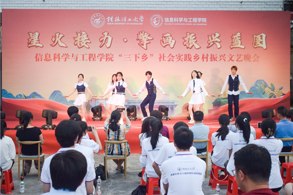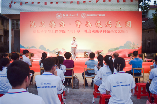 为引领和帮助广大青年学生在社会实践中受教育、长才干、作贡献的号召。7月6日,beat365官方网站信息科学与工程学院“三下乡”社会实践团队在桂林市灌阳县新街镇三树村举办“星火接力·擎画振兴蓝图——乡村振兴文艺晚会”。灌阳县驻村工作队队长金峰,新街镇镇长郑伟,新街镇人大主席唐军,新街镇党委副书记易塬舒,新街镇党委委员、组织委员周珊珊,信息科学与工程学院领导熊英、谢晓兰、陆绮荣、董明刚,学院辅导员蒋琼、于帅帅、崔之府、李雪,同时参与晚会的还有东阳村第一书记朱强、顺溪村第一书记陈文甫、商家村第一书记彭广生、三树村第一书记周剑凯、东阳村驻村队员李春海、学院暑期“三下乡”社会实践团队全体成员参加本次文艺活动。