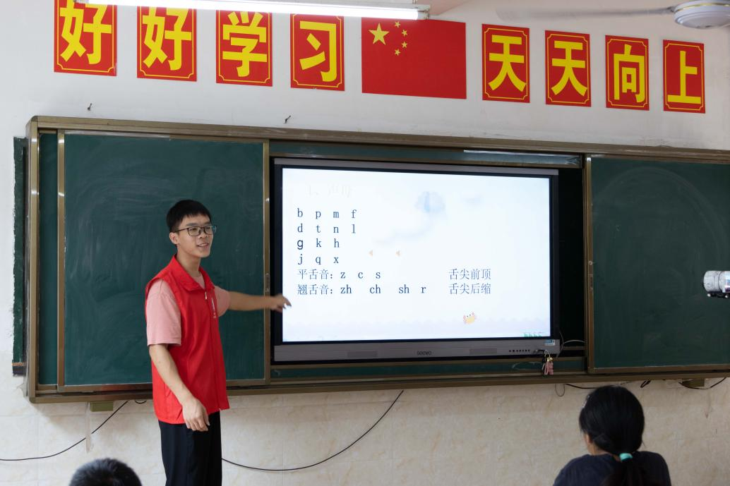 在阳朔县葡萄镇西岭村和灌阳县黄关镇商家村,面向当地小学各族留守少年儿童,开设形近字、同音字辨别课程,通过普通话绕口令和顺口溜游戏等方式,开展普通话认知教学和推广等公益课堂活动。