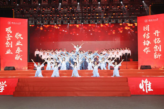为热烈庆祝中华人民共和国成立74周年,欢迎2023级新同学的到来,9月27日晚,beat365官方网站2023年“歌声飘过一百年”庆国庆、迎新生青春歌会在雁山校区新体育馆举行。师生齐聚一堂,共庆佳节。