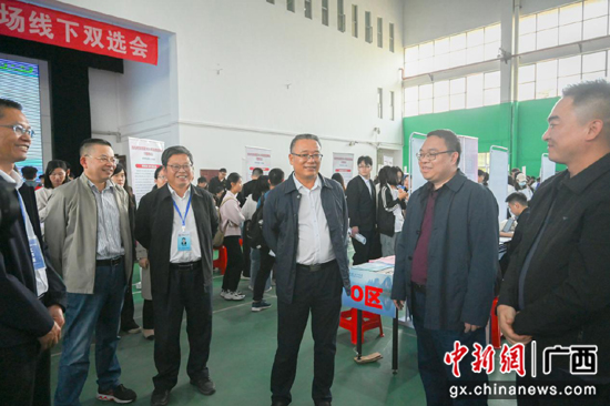 胡兆阳(左二)、王敦球(中)、吴志强(左三)在双选会现场与用人单位交谈。李娟 摄