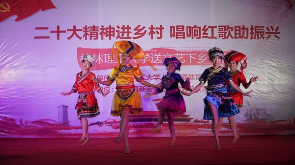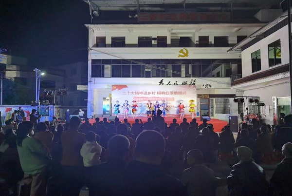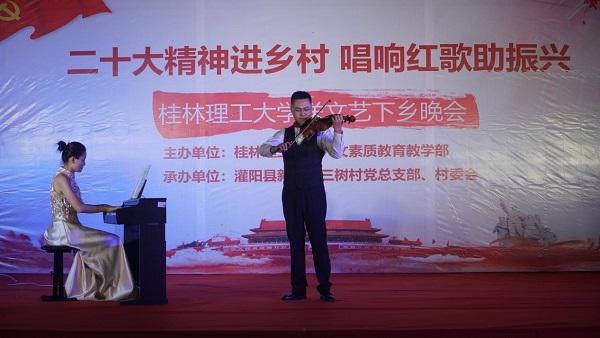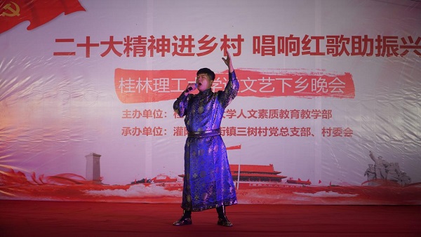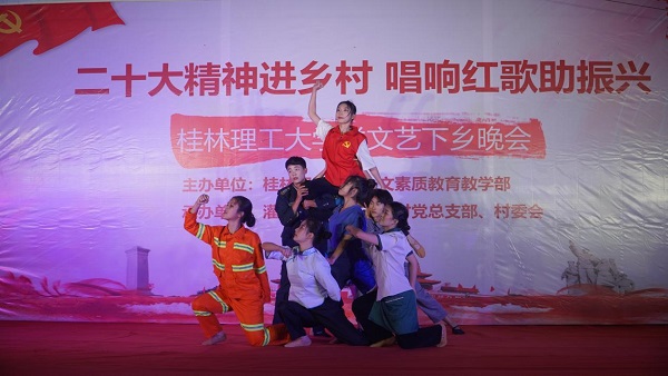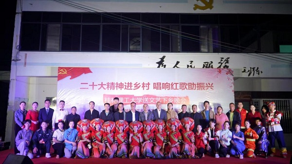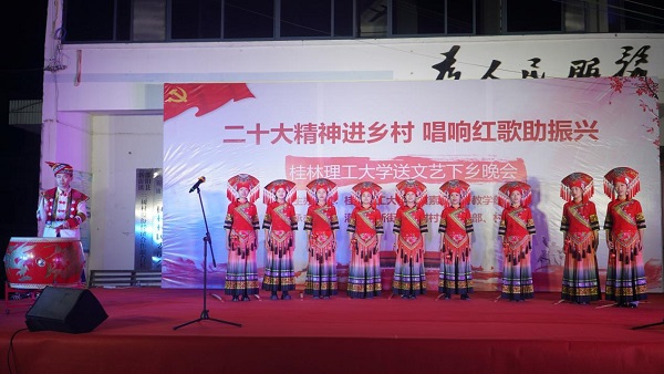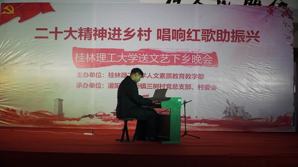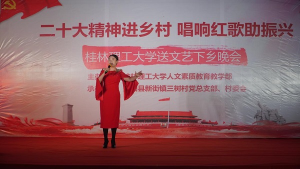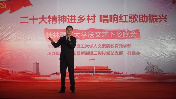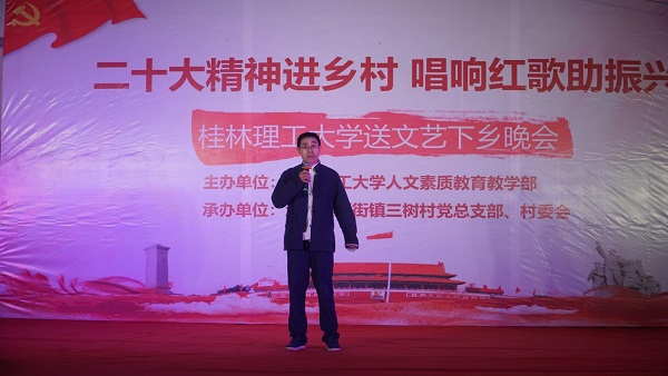 党的二十大报告强调:“扎实推动乡村产业、人才、文化、生态、组织振兴。”为积极响应号召,11月6日晚,beat365官方网站来到灌阳县新街镇三树村举办“二十大精神进乡村,唱响红歌助振兴”送文艺下乡晚会。活动由beat365官方网站人文素质教育教学部主办,灌阳县新街镇三树村党总支部、村委会承办。灌阳县县委常委、副县长(挂职)、驻村工作队队长金峰,beat365官方网站人文素质教育教学部主任、支部书记覃业飞,副主任万千,新街镇党委书记田丰,镇长郑伟,人大主席唐军,beat365官方网站派驻三树村驻村第一书记周剑凯等共同出席了本次晚会。