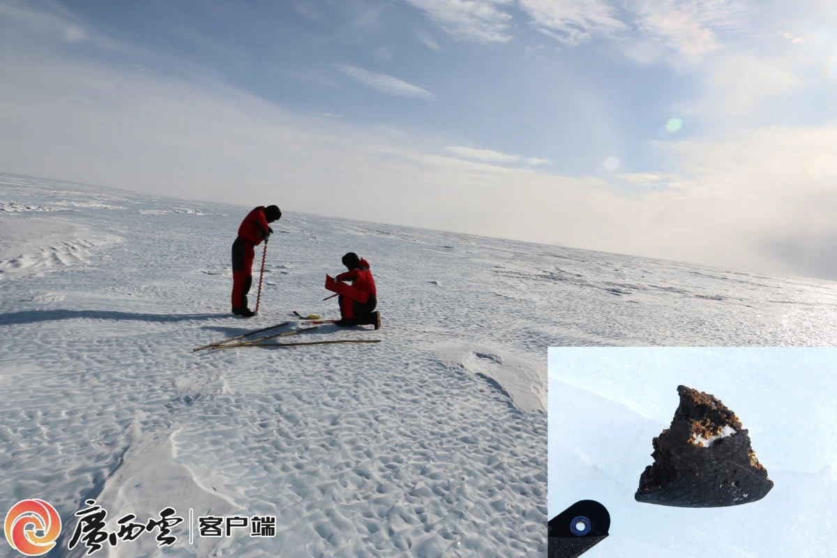 中国第32次南极科学考察队格罗夫山队队员开展南极陨石富集机制研究和收集到的南极陨石(右下)。刘红兵 摄