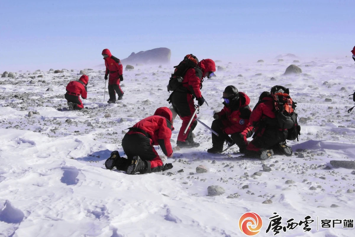 徒步冰天雪地,科考人员不断俯下身子,长时间盯着冰面,一找就是几个小时,甚至用卧爬的方法挖出小到沙粒的陨石。