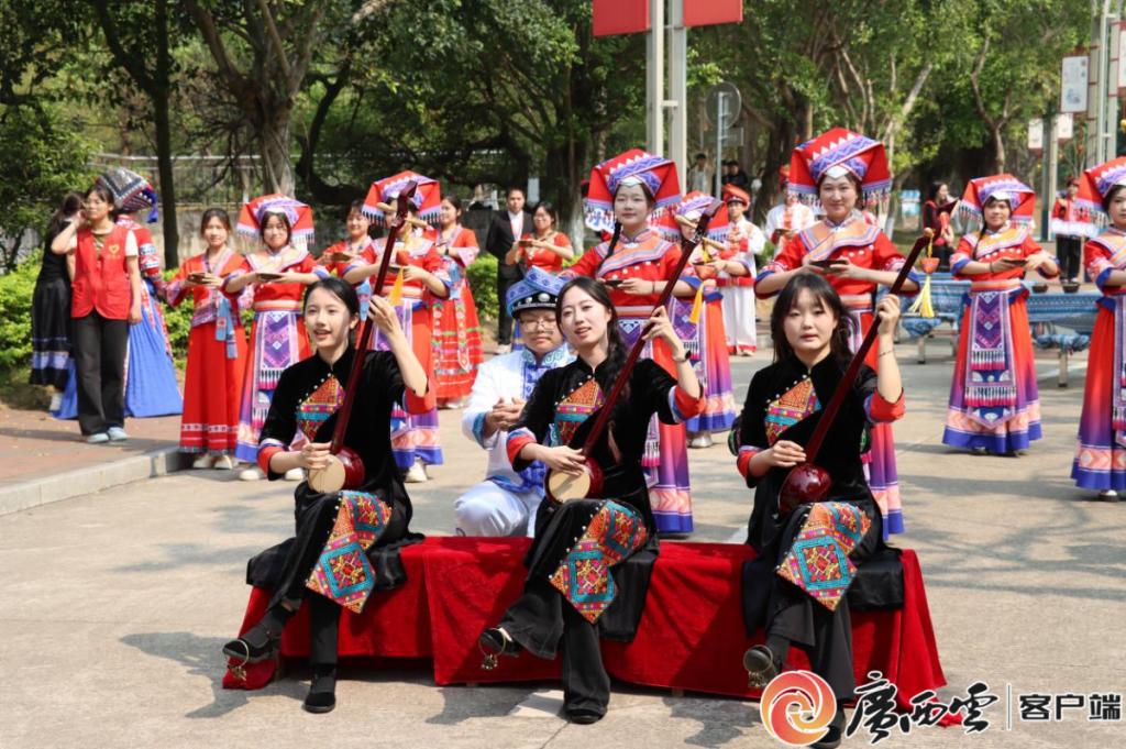 活动现场“桂味”十足。在校园特色文化园林广场——慧智园,身着民族服饰的桂工学子唱山歌,跳起绣球舞、竹竿舞、打榔舞,演奏壮族天琴,展示广西12个世居民族服饰,为观众带来了一场沉浸式民俗文化视听盛宴。各族师生共同体验踩高跷、打油茶、制漆扇、碰彩蛋、打陀螺、投壶等民俗趣味游戏,品尝民族特色美食,参与抛绣球、舞狮、珍珠球等民族体育项目,让民族文化以更贴近当代语境的形态浸润校园。
