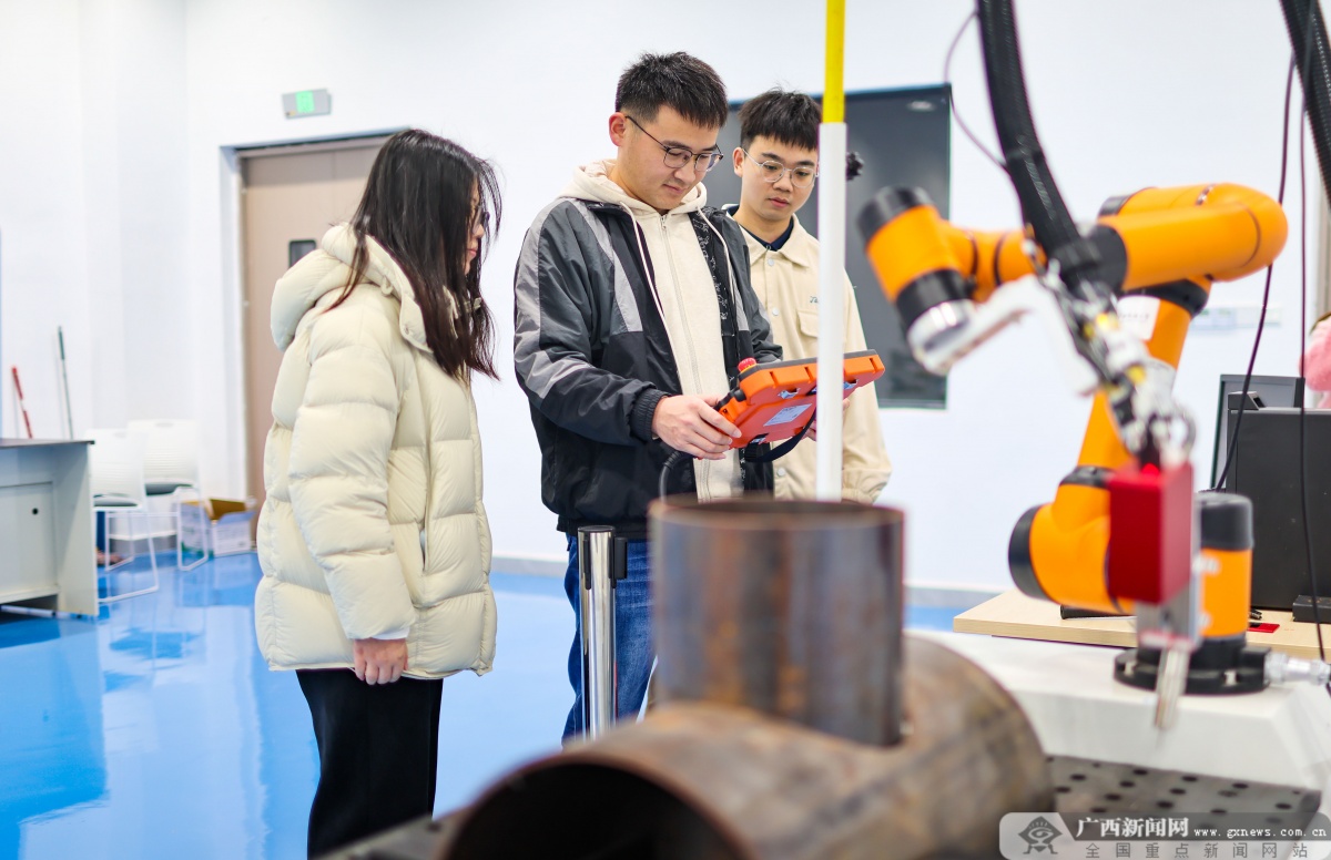 广西人工智能学院的老师正带着学生操作机械手进行精细焊接的作业。广西云-广西日报记者 游拥军/摄