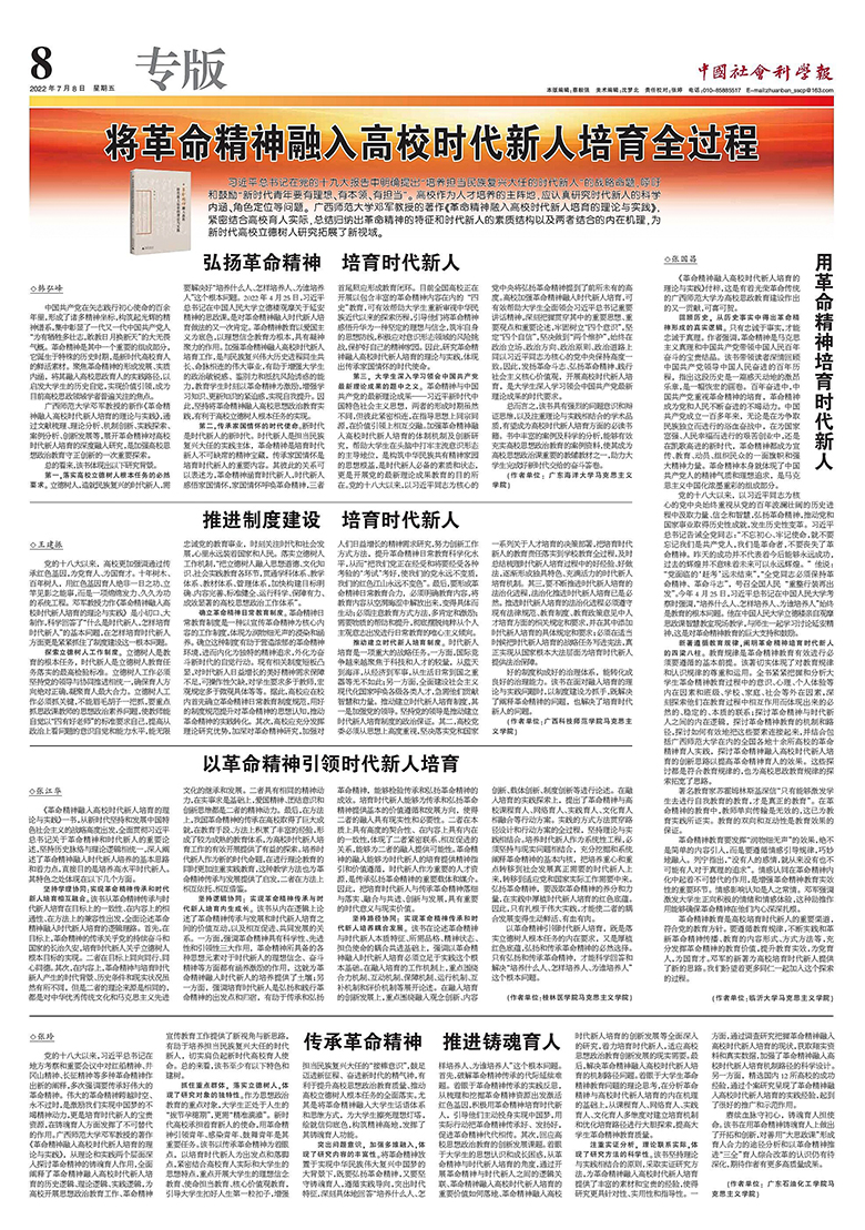 习近平总书记在党的十九大报告中明确提出“培养担当民族复兴大任的时代新人”的战略命题,呼吁和鼓励“青年一代有理想、有本领、有担当”。高校作为人才培养的主阵地,应认真研究时代新人的科学内涵、角色定位等问题。beat365党委书记邓军的著作《革命精神融入高校时代新人培育的理论与实践》,紧密结合高校育人实际,研究革命精神融入高校时代新人培育的机制路径、实践探索与创新发展,总结归纳革命精神的特征和时代新人的素质结构以及两者结合的内在机理,对高校开展思想政治教育工作、革命精神的宣传培育和践行工作贡献方法论,为新时代高校立德树人研究拓展了新视域。《革命精神融入高校时代新人培育的理论与实践》自出版以来,受到广泛关注,《中国社会科学报》专版刊登了对邓军书记新书的评论。