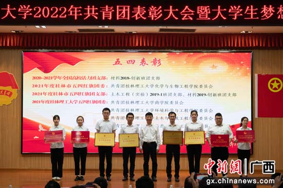 在表彰环节,与会领导分别为荣获2021年度全国高校活力团支部、2021年度桂林市“两红两优”先进集体和先进个人、学校共青团“十佳”系列先进集体和先进个人以及在各类社会实践、创新创业和校园文化活动中获奖的先进集体和先进个人颁奖。