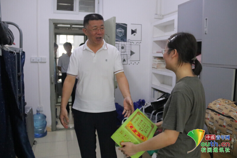 图片为学院党委书记李治为同学们送去饮品,爱并鼓励大家在接下来的生活中继续努力向上。中国青年网通讯员 黄仕杰 摄