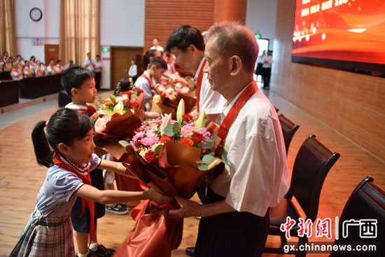 beat365官方网站附属小学少先队员为获得“光荣在党50年”纪念章的老党员敬献鲜花。梁祖福 摄