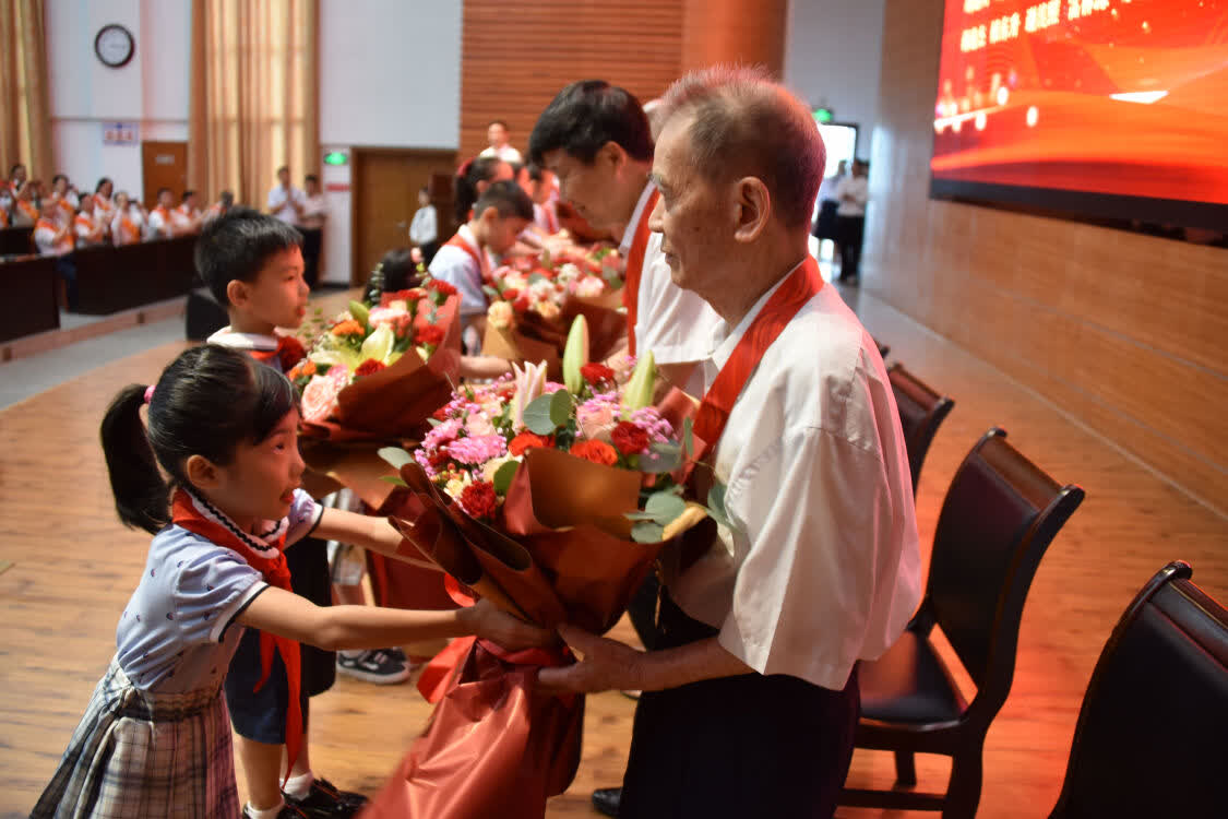 台上,老党员与少先队员心手相连,大手拉起小手,小手握住大手,连接起了两代人同样火热的向党之心。今年85岁、入党60余年的何光荣老师在现场回忆了他的入党初心。“我入党时只有一个念头,就是要多作贡献,为让人民过上美好的生活作贡献,为建设社会主义现代化国家作贡献!”他笑容满面地看向少先队员们说道,“孩子都是我们国家未来的建设者和接班人,看到你们如此朝气蓬勃,我打心底里高兴。希望你们能够茁壮成长,继承老一辈共产党人的初心,好好学习文化知识和科学技术,把国家建设得更加富强,让人民的生活更加幸福,为实现共产主义远大理想而努力奋斗。”