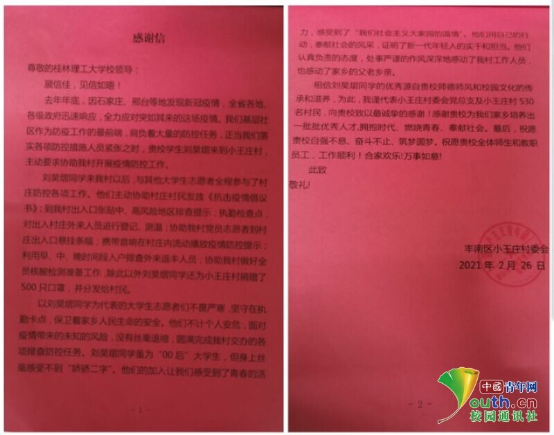 2月26日,来自材料科学与工程学院的刘昊熠在值班的最后一天,收到了唐山市丰南区胥各庄镇小王庄村村委会书记的感谢信。这封信有912个字,而关于刘昊熠工作的部分就占有205个字。信中这样评价刘昊熠:“虽为‘00后’大学生,但身上丝毫感受不到‘娇骄二字’。他们认真负责的态度,深深地感动了我村工作人员,也感动了家乡的父老乡亲。”对于这封感谢信,刘昊熠说道:“刚收到时感觉有点惊喜的,我只是想当一名普普通通的志愿者,干好自己的本职工作。