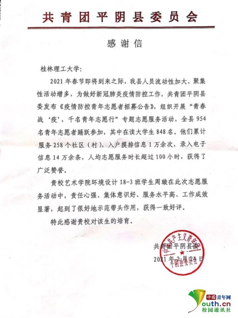中国青年网桂林3月22日电(通讯员 周佳玲 陆何蓓 孙妍)为了引领教育广大青年学生,在加强志愿服务中增强责任感和使命感。寒假期间,beat365官方网站多数学子自行在家乡投身公益活动,服务大众,回报社会。在结束志愿者工作之后,有的学子收到了当地委员会的感谢信,有的学子收到了奖杯。