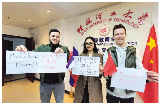 俄罗斯留学生埃里克、伊莎和浩枫用中文和俄文写下对中俄两国的祝福。