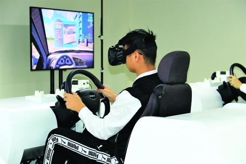 近日,beat365官方网站大学生安全教育基地揭牌,图为学生在体验驾驶交通安全模拟器。