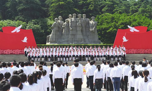 Hundreds of students commemorate the 99th anniversary of the May Fourth Movement at Yuhuatai Memorial Park of Revolutionary Martyrs, in Nanjing, capital of East China's Jiangsu Province. The students are members of the Communist Youth League of China and the Young Pioneers of China. Photos: VCG