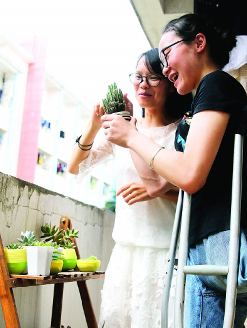 生性开朗的黄素雅笑对生活,她和舍友在宿舍前养了很多“肉肉”。