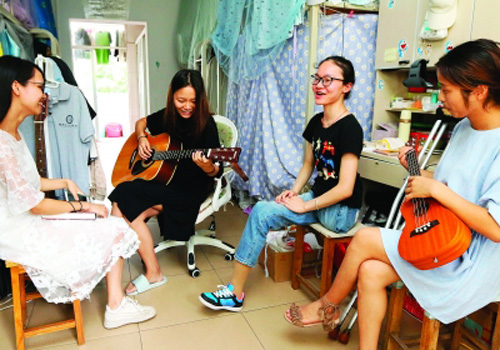 到今年9月份开学,黄素雅已经步入大三了。来到黄素雅宿舍时,她正和舍友们围坐一堂,拿着吉他和尤克里里,边弹边唱歌。