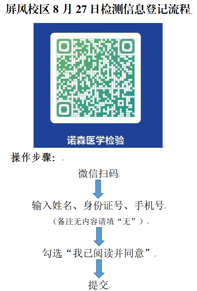 1.个人信息登记。为提高效率,此步骤请大家在进场排队前完成。除屏风校区8月27日检测外,此次核酸检测统一使用“桂核酸”微信小程序进行信息登记,请参加核酸检测的师生用手机微信扫码登录“桂核酸”小程序,并完成信息登记工作(见附件1)。如有老人、小朋友不便填写的,可由家属帮助填写登记。信息登记成功后将会生成个人唯一的“桂核酸检测码”(建议手机截图保存,以便调出使用)。