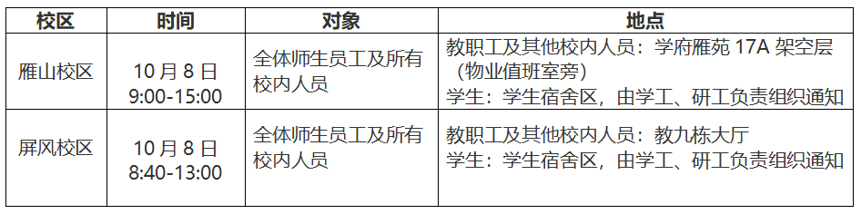 全体学生、教职员工(含校外)及其住校园内的家属、校内从事经营活动人员、校内工地施工及管理人员、校内其他住户。(附属小学、幼儿园由属地教育管理部门统筹安排检测)