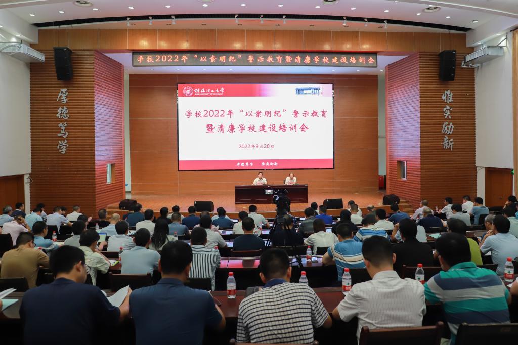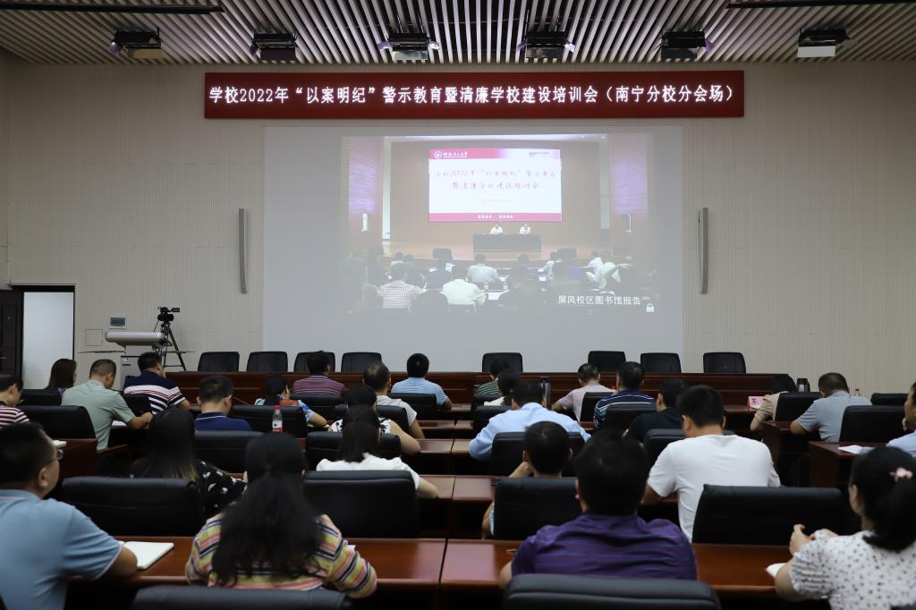 为贯彻落实新时代全面从严治党要求,深入推进清廉学校建设与反腐败工作,9月28日,学校在屏风校区图书馆报告厅召开了2022年“以案明纪”警示教育暨清廉学校建设培训会。学校党委常委、纪委书记韦学敏出席会议并作专题报告。学校党委常委、组织部部长唐壮东主持会议,党委常委、宣传部部长叶昊、统战部部长邱杰,党委委员、校长助理、教师工作部部长辛立章、南宁分校校长罗盛锋,全体中层干部、二级纪委书记、直属党支部纪检委员、专职纪检干部参加会议,南宁分校设分会场。