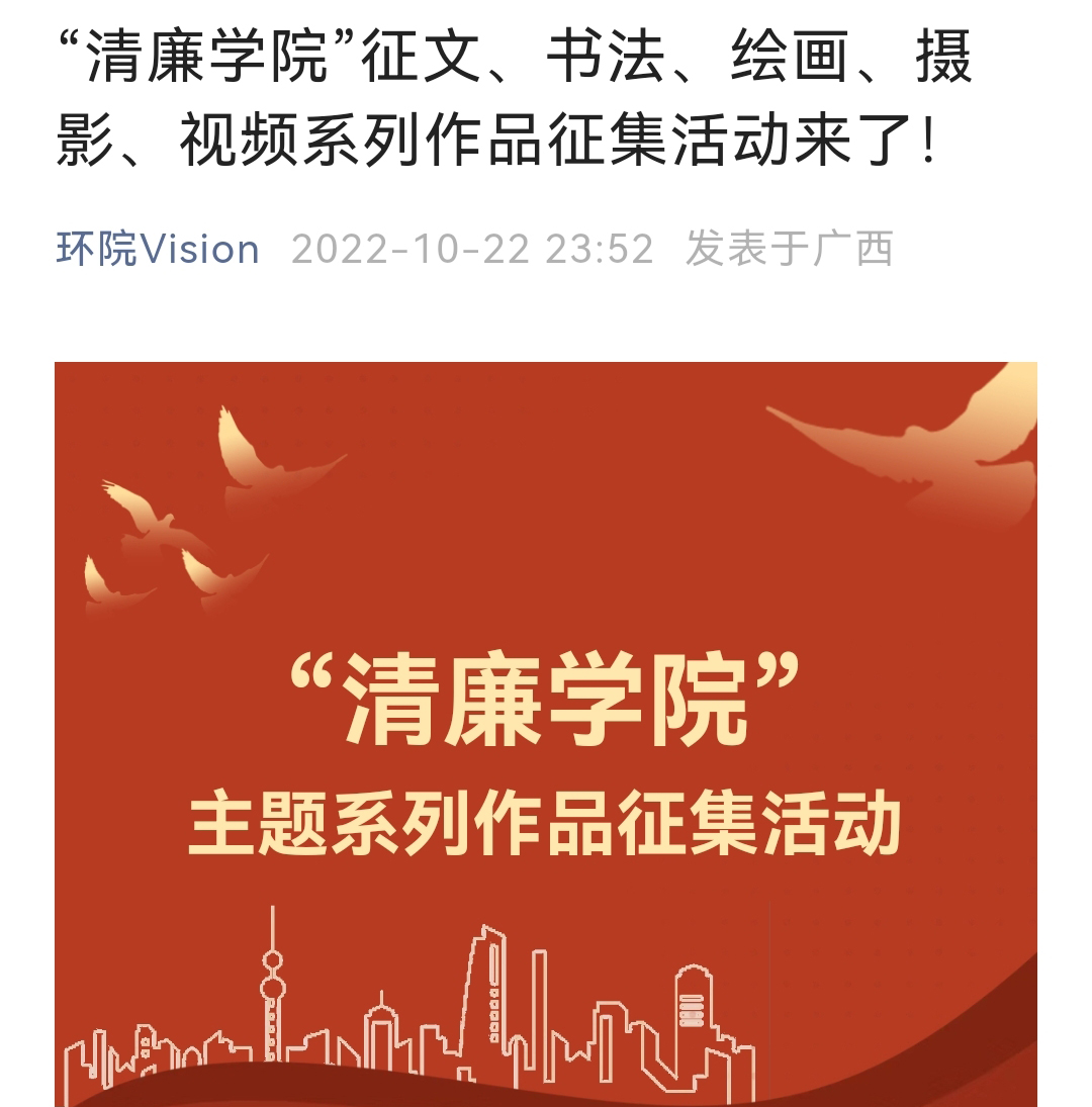 开展以“清廉学院”为主题的征文、书法、绘画、摄影、视频系列作品征集活动。通过本次征集活动全面深入推进“清廉环院”建设,着力推进学院“不敢腐、不能腐、不想腐”的政治生态和育人环境,永葆党的马克思主义政党本色,教育引导广大师生不忘初心、清廉自守,勇于担当责任,以身作则、克己奉公。