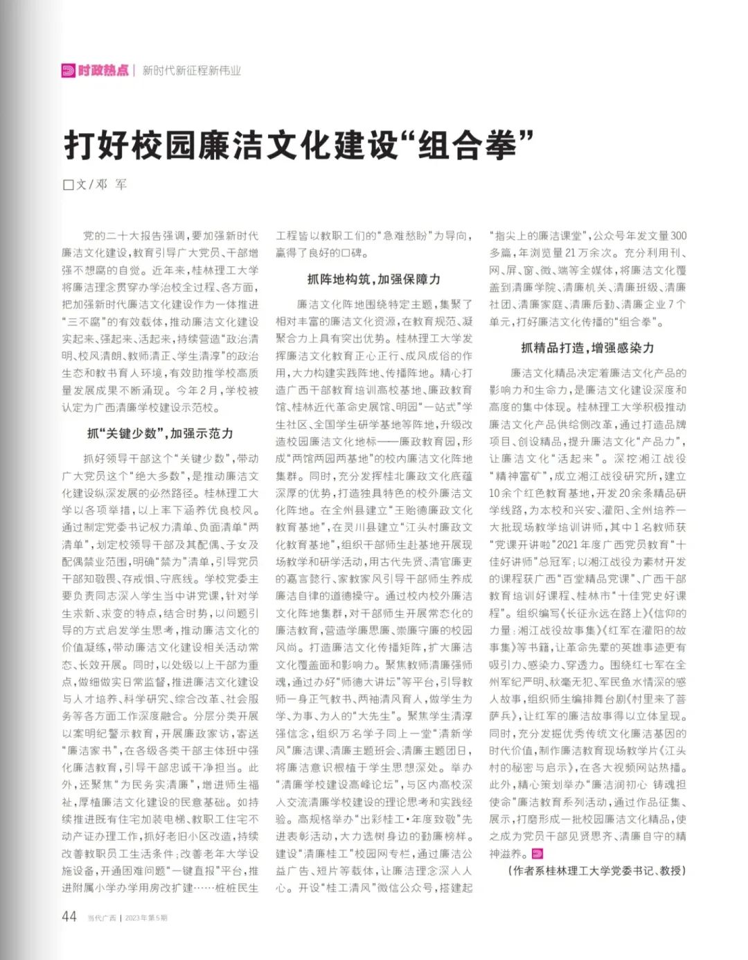 党的二十大报告强调,要加强新时代廉洁文化建设,教育引导广大党员、干部增强不想腐的自觉。近年来,beat365官方网站将廉洁理念贯穿办学治校全过程、各方面,把加强新时代廉洁文化建设作为一体推进“三不腐”的有效载体,推动廉洁文化建设实起来、强起来、活起来,持续营造“政治清明、校风清朗、教师清正、学生清淳”的政治生态和教书育人环境,有效助推学校高质量发展成果不断涌现。今年2月,学校被认定为广西清廉学校建设示范校。