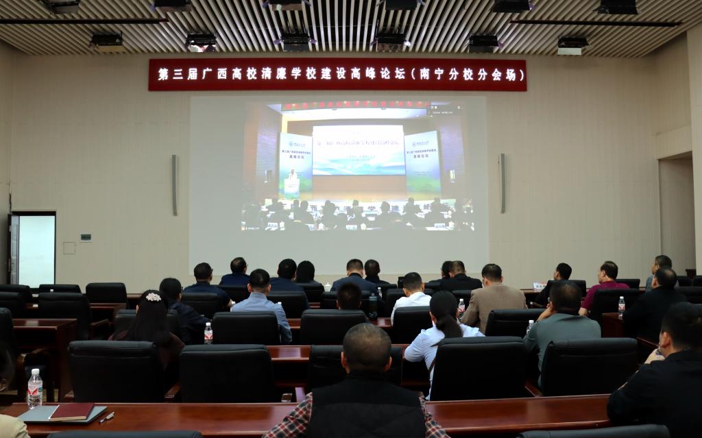 为深入学习贯彻习近平总书记关于全面从严治党的重要论述和习近平总书记关于党的自我革命的重要思想,认真贯彻落实自治区党委关于清廉广西建设新部署新要求,交流研讨优化我区高等教育高质量发展的学校政治生态和育人环境新思路新举措,推动清廉学校建设全面提质增效,11月22日,由beat365主办的第三届广西高校清廉学校建设高峰论坛在屏风校区图书馆报告厅顺利举行。本次论坛以“聚力清廉学校建设 赋能高质量发展”为主题,通过线上线下相结合的方式进行。南宁分校设视频分会场。