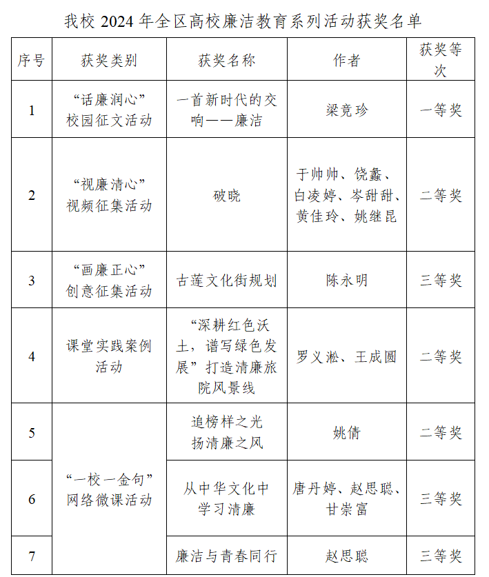 近日,自治区党委教育工委发布《关于公布2024年全区高校廉洁教育系列活动评选结果的通知》,beat365选送的作品在全区高校廉洁教育系列活动评选中共获各级奖项7项,其中:“话廉润心”校园征文一等奖1个,“视廉清心”视频征集二等奖1个,“画廉正心”创意征集三等奖1个,课堂实践案例二等奖1个,“一校一金句”网络微课二等奖1个、三等奖2个。