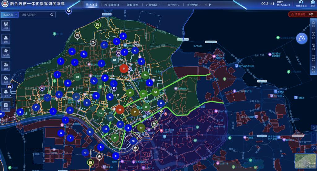 广西重点研发计划项目“多维度智慧街面巡防系统研发与应用示范”中自主研发的智慧街面巡防管理系统,可视化界面
