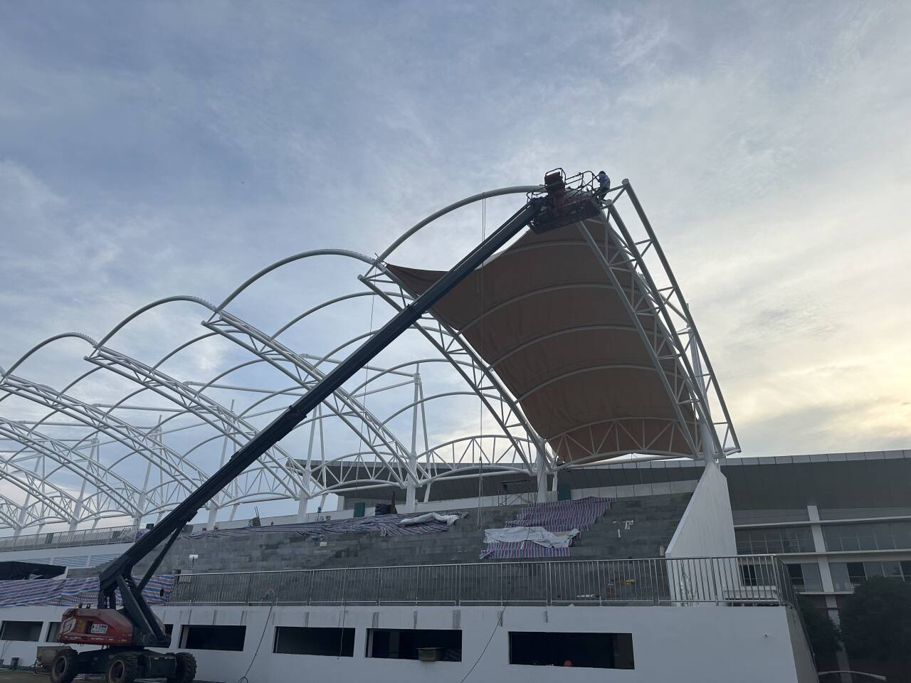 雁山校区田径运动场改造工程进入最后的顶膜安装阶段,基建处克服酷暑高温和高空室外作业的不利影响,严控施工质量,确保新学期正常使用。
