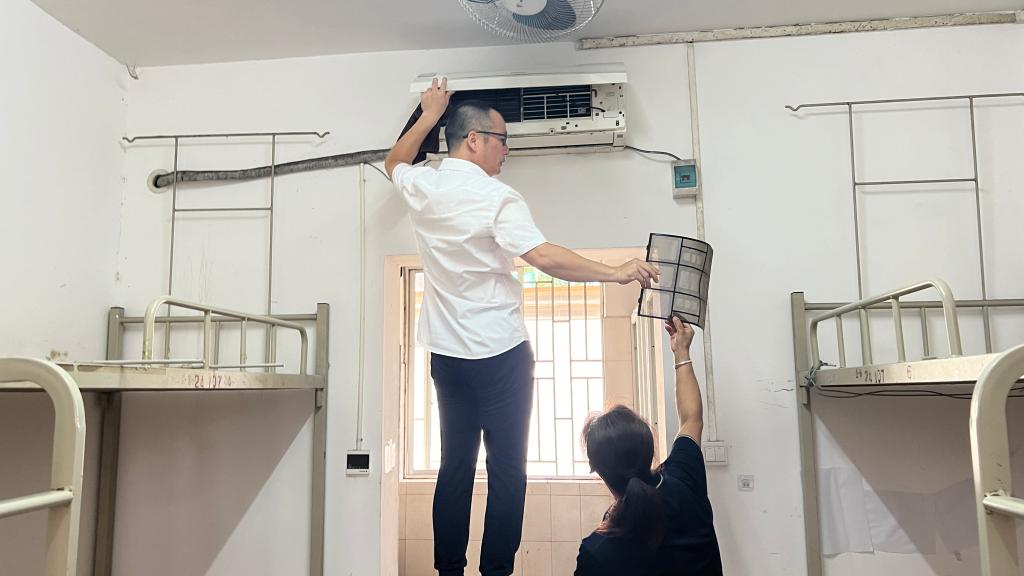 为确保暑期留校学生的住宿生活,学生公寓管理中心以高度的责任心,战高温、耐酷暑,坚守工作岗位,扎实推进修缮改造、家具更换、宿舍清洁、空调清洗、安全检查等各项工作,全心全意为学生们做好服务保障工作。