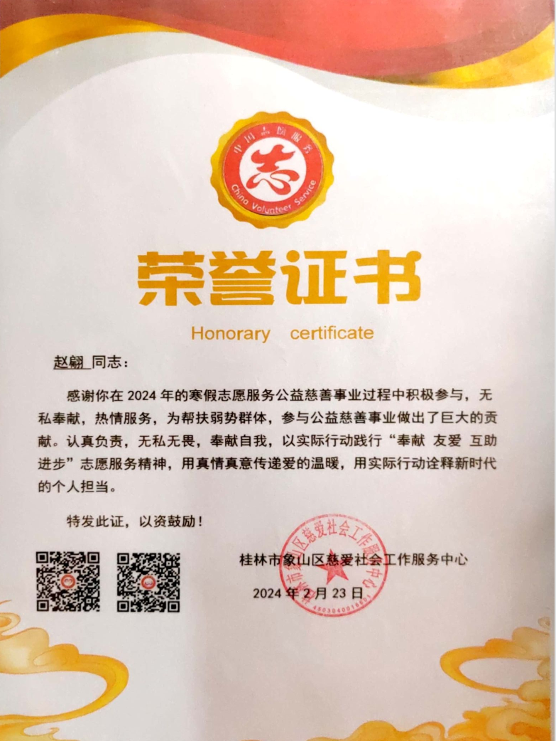 在桂工校园里,总能看到赵翩步履匆匆的身影。作为学院科技协会副会长和班级班长、团支书,这个工科女生以超乎寻常的行动力,在三年多的时间里策划组织班级活动20余场,荣获校级“十佳团干部”称号。更令人动容的是,她在寒来暑往间累计完成超过200小时的志愿服务,用自己的实际行动践行青年一代的社会责任与担当。