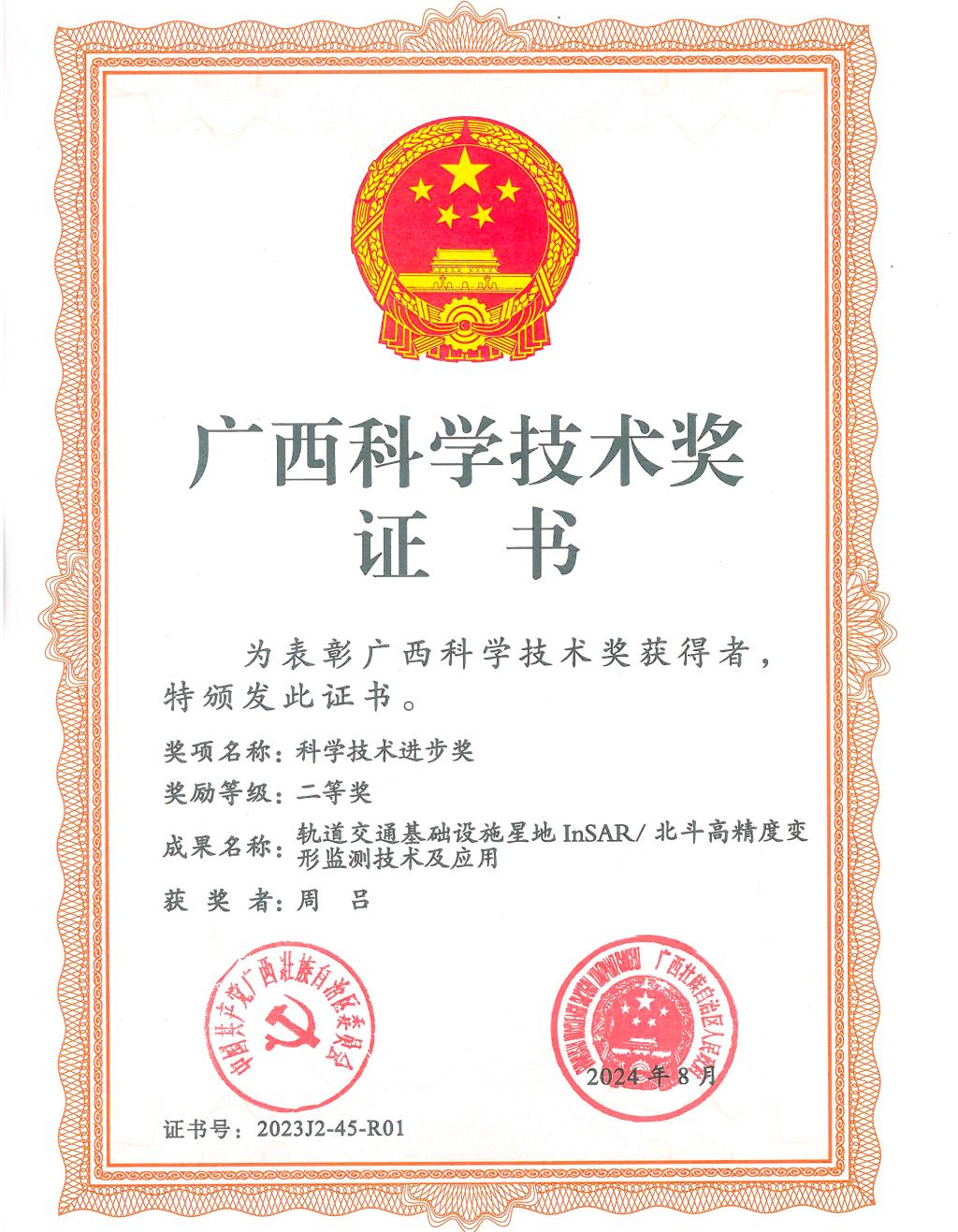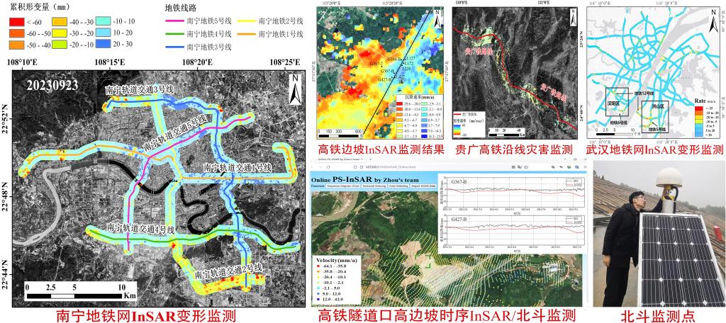 周吕副教授聚焦服务国家加快建设交通强国重大战略决策和加快完善国家综合立体交通网重大战略部署,锚定轨道交通安全监测领域核心技术问题,创建轨道交通基础设施星地InSAR/北斗高精度变形监测技术体系,攻克北斗/GNSS变形监测噪声滤波与形变信息精确提取关键技术,研发轨道交通基础设施InSAR/北斗多尺度多时态三维可视化变形监测预警系统,在区内外轨道交通重大工程中发挥关键作用。2024年,周吕副教授项目成果《轨道交通基础设施星地InSAR/北斗高精度变形监测技术及应用》获2023年度广西科学技术进步奖二等奖。同时,他还获得了中国卫星导航定位科技进步奖二等奖。