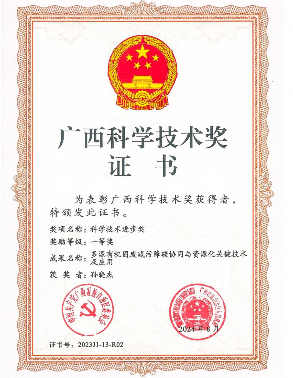 2024年,孙晓杰教授项目成果《多源有机固废减污降碳协同与资源化关键技术及应用》荣获2023年度广西科学技术进步奖一等奖,并作为第一指导老师指导学生获得中国国际大学生创新大赛(2024)“数广集团杯”广西赛区选拔赛金奖、第十一届“挑战杯”广西大学生创业计划竞赛金奖。