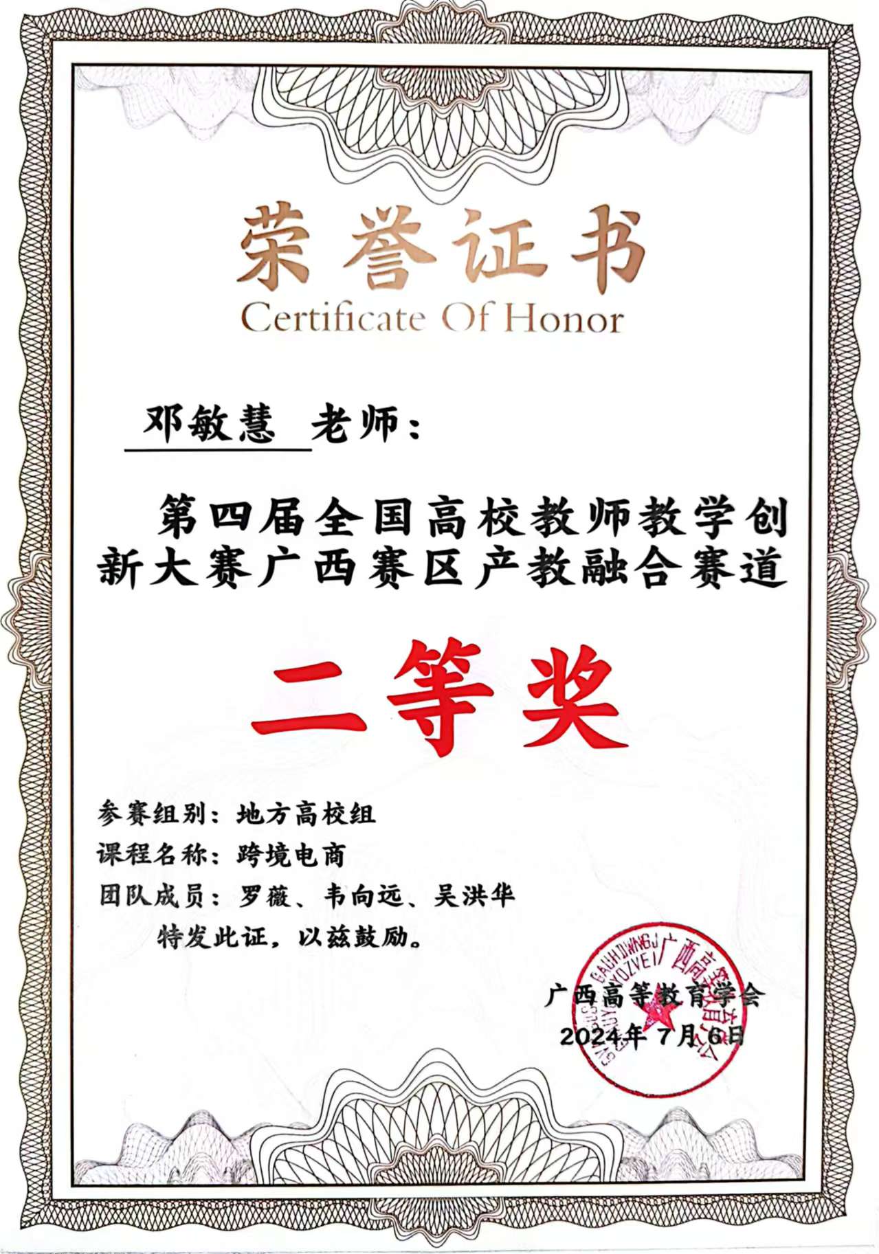 邓敏慧老师荣获第四届全国高校教师教学创新大赛广西赛区产教融合赛道二等奖