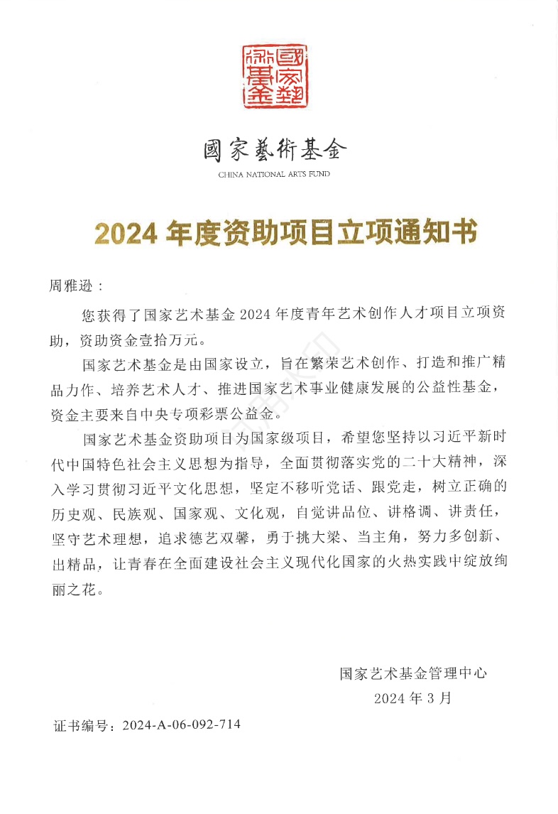 周雅逊老师获2024年度国家艺术基金项目