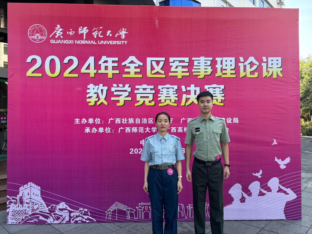 坚持用党的创新理论武装思想、推动国防教育工作开展。在全区首次探索17天新生军训,首次在训练中引入无人机、机器狗、智能机器车组成的智能无人装备,圆满完成5835名新生军训任务,军训短视频总点击量超过100万次,有效提升了学校社会影响力;持续做好征兵预检机制,全年共有175名学生踊跃报名参军,62名学生成功入伍,超额完成征兵任务;教研室教师在2024年高校教师国家安全教育教学风采展示活动中荣获“国家安全教育教学特别风采教师”(本次比赛最高奖项),在全区军事理论课竞赛中荣获一等奖1项、二等奖1项;持续做好退役复学学生引导培育,国防教育协会退役学子积极参与桂林市抗洪清淤志愿活动,4名退役大学生士兵成功获得保研资格。
