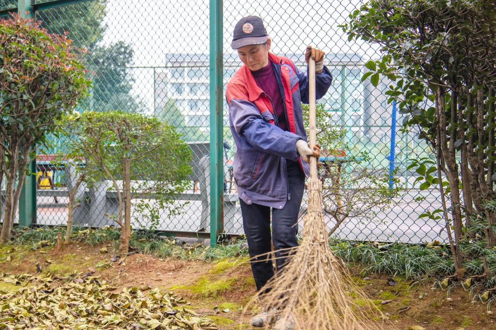 崔玉串阿姨正在清扫落叶