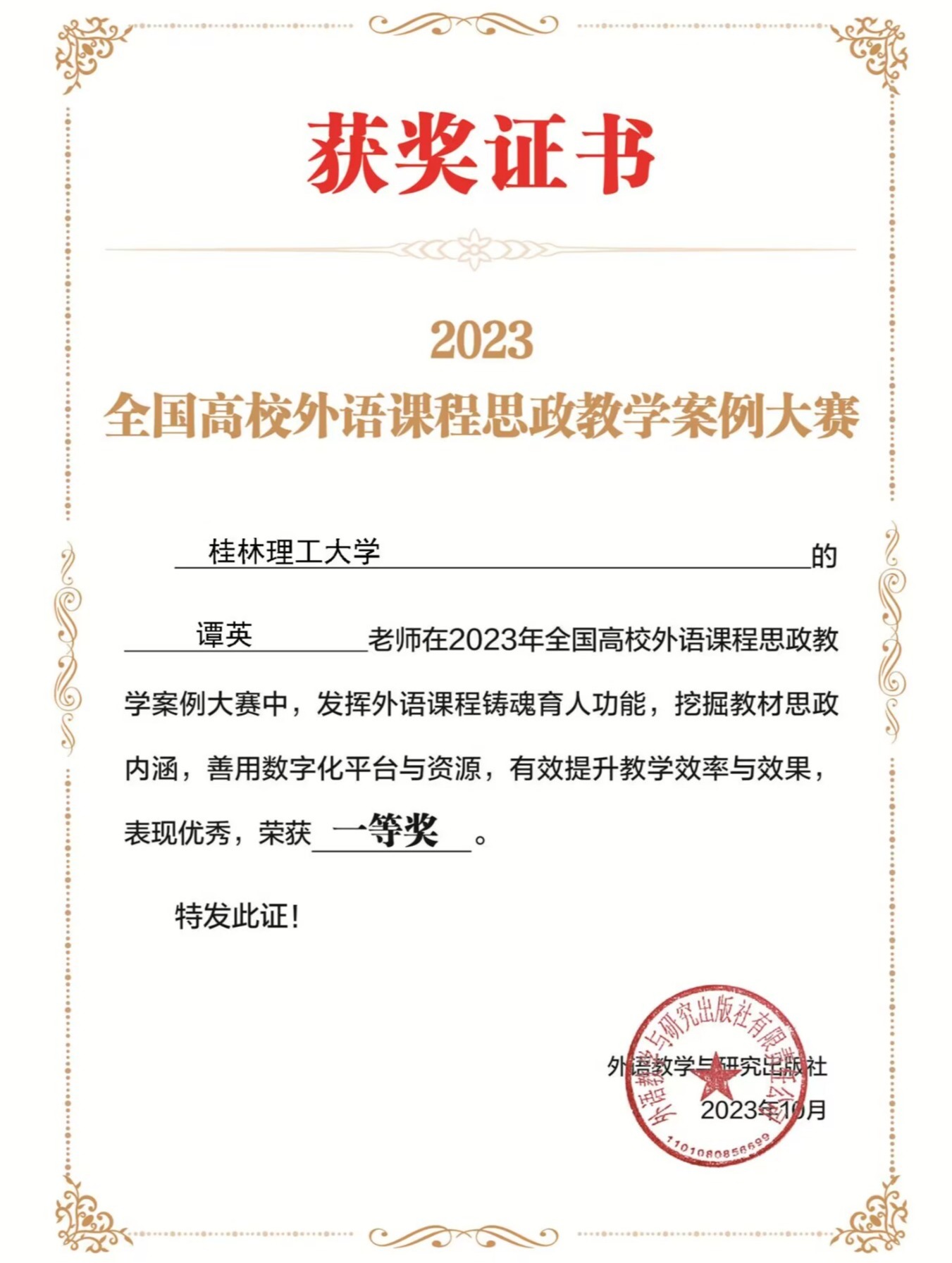 谭英老师获2023年全国高校外语课程思政案例大赛一等奖