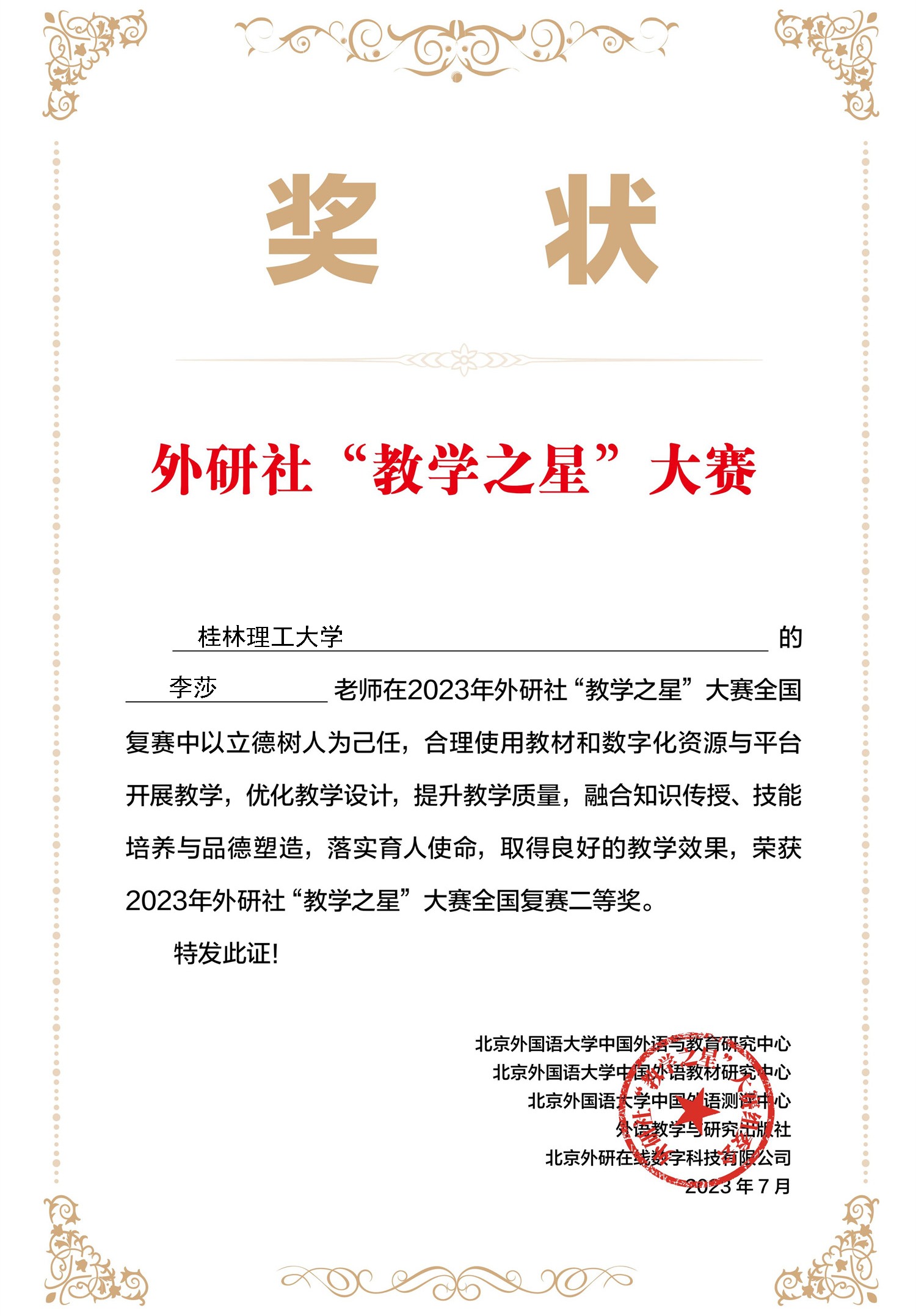 李莎老师获2023年外研社“教学之星”大赛全国复赛二等奖