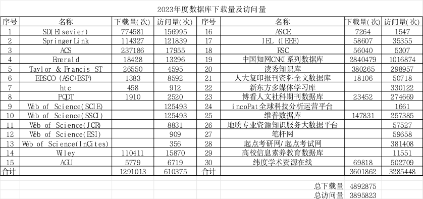 图书馆持续加强图书馆文献资源建设,不断优化文献资源保障体系和馆藏布局结构,深入分析研究文献资源利用现状,不断提升文献资源建设质量。2023年新增纸质图书9.7万册,同比增长24%。新增4个数据库,数据库(不含子库)总量达30个,同比增长15%。