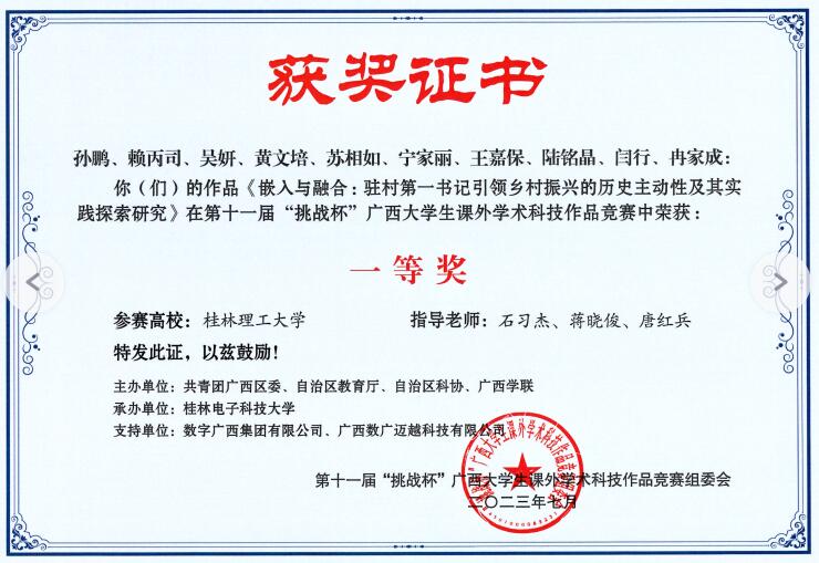 2023年,学院坚决贯彻落实立德树人根本任务,各领域业绩成果突出。学生赛事指导方面,专业竞赛获国家级赛事奖项8项、省部级赛事奖项37项,各类协会赛事奖项17项;创新创业类赛事获挑战杯国赛三等奖1项、区赛一等奖2项、三等奖2项;获“互联网+”区赛铜奖4项。学生四级通过率高达79.47%;考研录取率为10.22%,2人入选2023年学校研究生支教团(占全校2/5);学院年度就业率达95.2%,全力扭转了近年学院就业率与就业增长率不高、学生就业质量不高的困境。团学组织建设方面:学院行政管理2019-1班获全国百强团支部、桂林市十佳团支部荣誉称号。