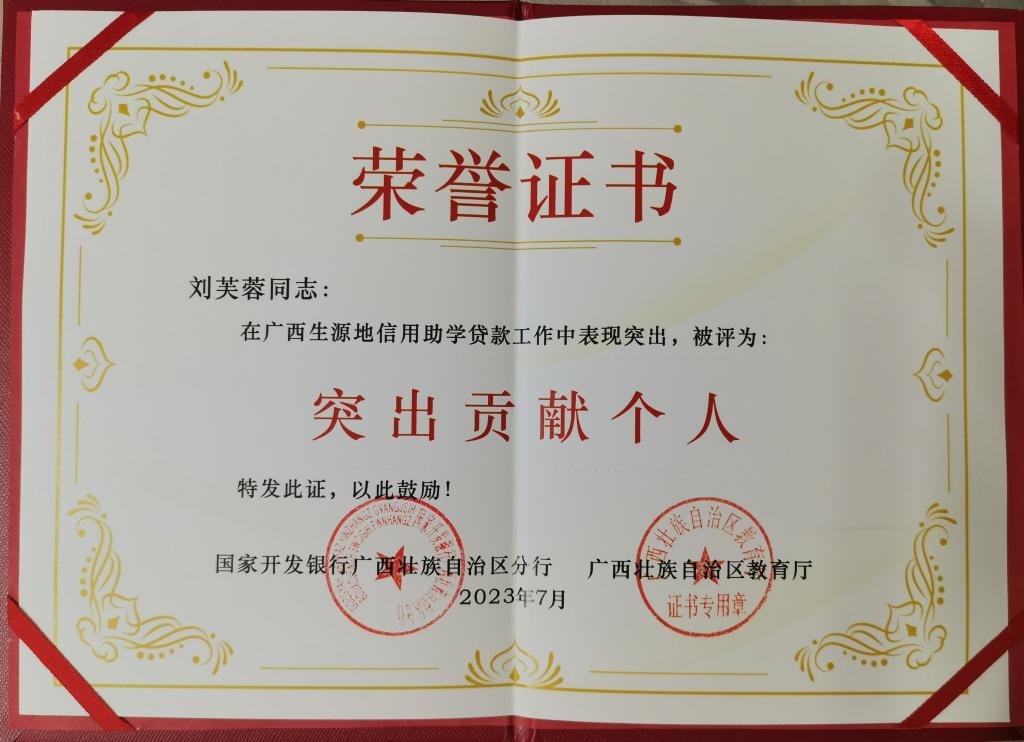 辅导员刘芙蓉老师获广西生源地信用助学贷款“突出贡献个人”荣誉称号