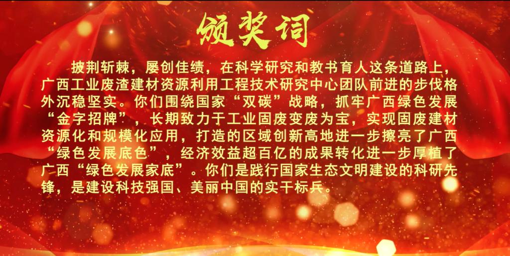 组委会给予“广西工业废渣建材资源利用工程技术研究中心团队”的颁奖词