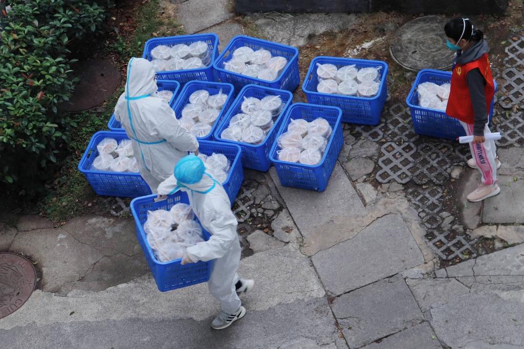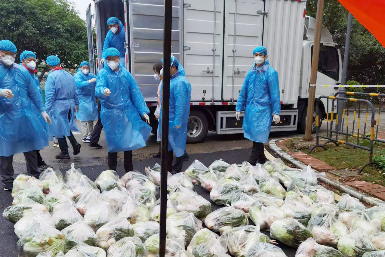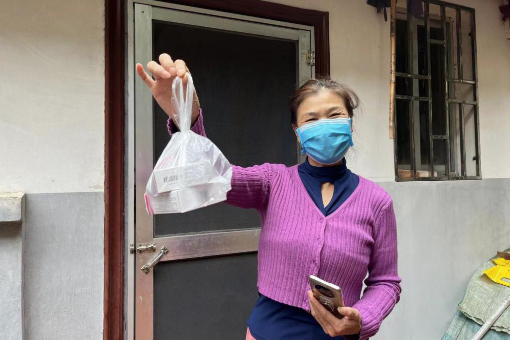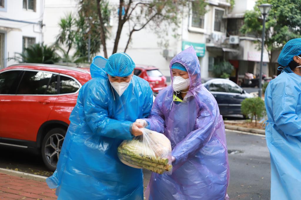 为社区住户送上蔬菜、牛奶和药物等物品