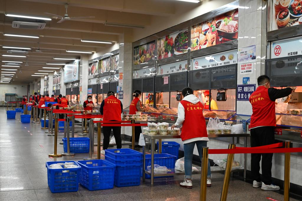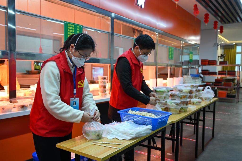 辅导员在食堂打包饭盒