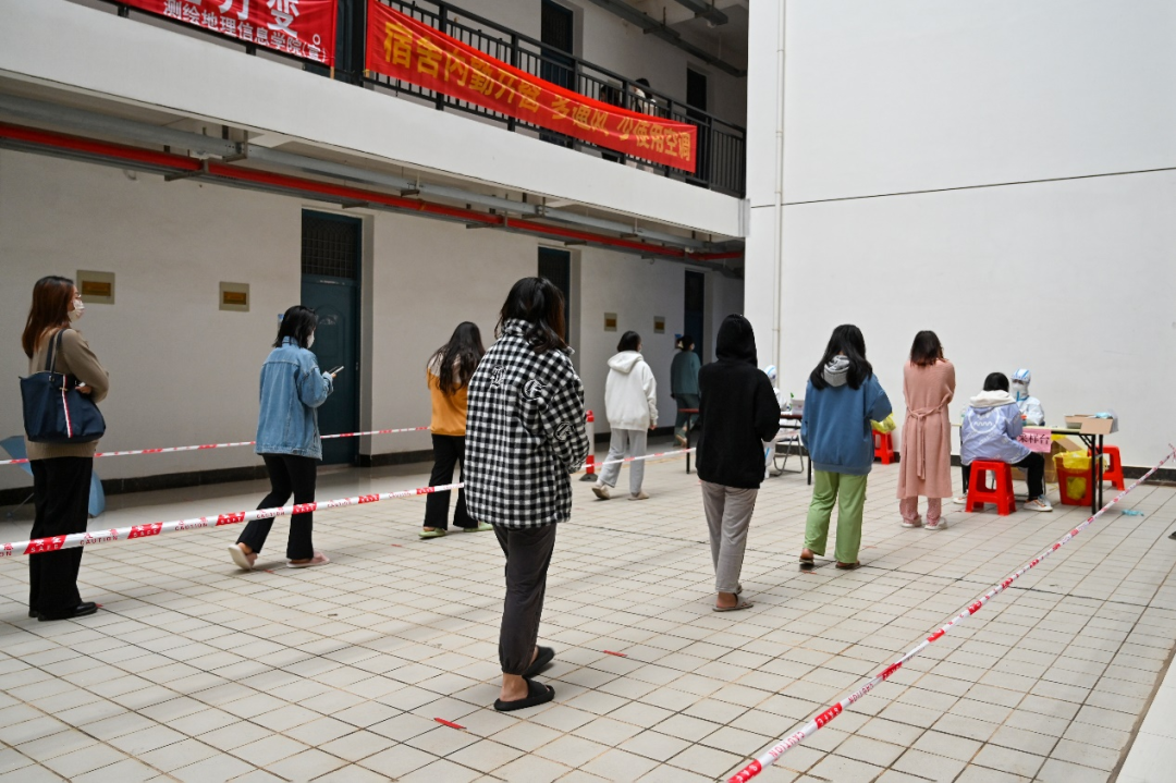 “屏风6栋需要的500个核酸检测拭子已经在路上了,预计10分钟后到检测台”“封箱纸和转运箱在路上了,请稍等,马上送到!”“请各位同学佩戴口罩,尽快到楼下做核酸。感谢同学们对学校防疫工作的理解与支持!”“请同学们保持两米安全距离,有序排队扫码”……学工队伍肩负着指挥员、协调员、登记员、巡逻员、宣传员等多重角色,建立涉疫风险应急处置机制,在各部门的默契合作下,各环节严密有序,高效完成全校的疫情防控综合协调工作。