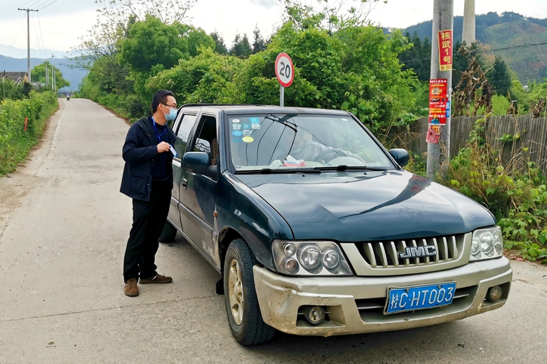“您好,请出示一下您的健康码和行程卡,并扫码配合我们进行信息登记。”东阳村第一书记唐红兵、工作队员陈回归在入村主要路口卡点值勤,对进出村子的人员车辆进行严格登记,坚决守住疫情防控狙击战“村级防线”,全力以赴保障人民群众生命安全和身体健康。